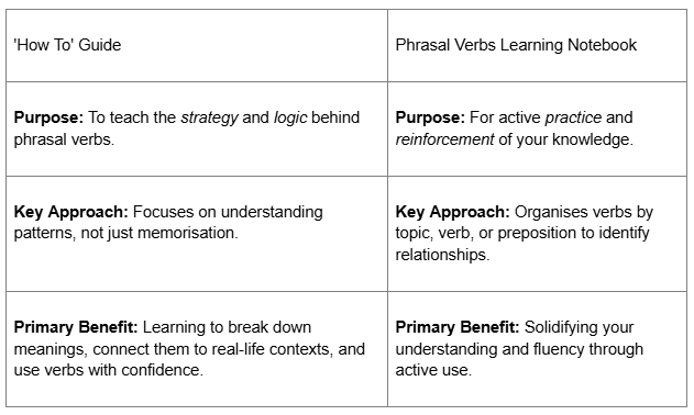 The Guide decodes the “why”—the hidden logic and patterns that govern phrasal verbs. The Notebook then provides the structured “how,” letting you see those very same patterns in action through its unique organisation, cementing the logic through targeted practice. Together, they create a complete cycle of learning and reinforcement.